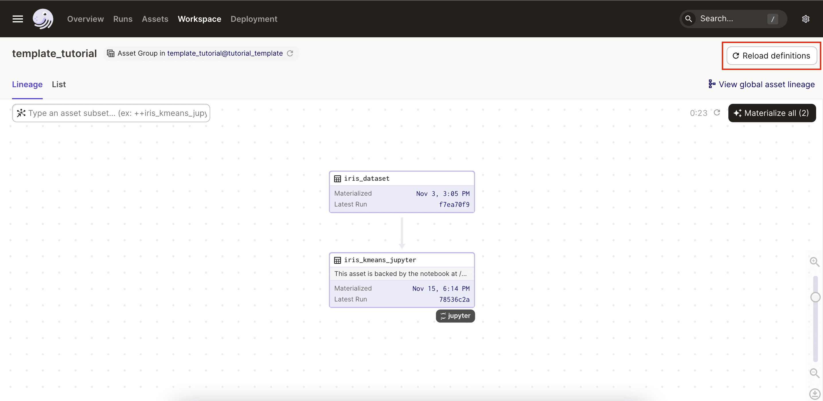 At this point, the iris_dataset asset should display above the iris_kmeans_jupyter asset as an upstream dependency: